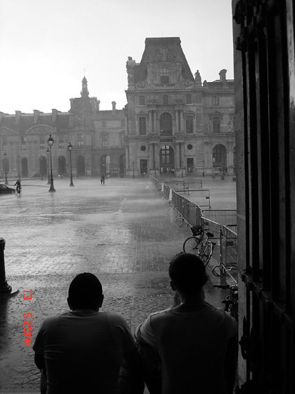 當我與同伴在偌大的歷史宮殿裡悠蕩一天後,接近五點時才由透明倒金字塔下方緩緩爬升到廣場,整座廣場充斥著各大廠牌的數位相機,各國遊客的相同開麥拉笑臉,偶而還有令人驚艷的獨特POSE展示可觀賞,然而,一場傾盆大雨卻打得那些沈浸在拍照中的遊客,四散逃逸。