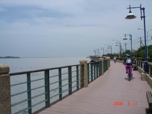 沿途的風景,無須形容,因為我很專心的騎著我租來的高級登山車,渴望著第二次的休息。不過,和周圍的淑女車比起來,我的登山車好像太專業了,在租借時,我莫名其妙就租到最貴的,變速性能優,還有舒適座墊,最重要的是,放水瓶的貼心置物架(愛爾沙莫名堅持一定要有這個配備!)。雖然感覺好像大材小用,但是在到達淡水榕堤前,我已學會操控變速自如,總算沒有浪費了它一身好本領。