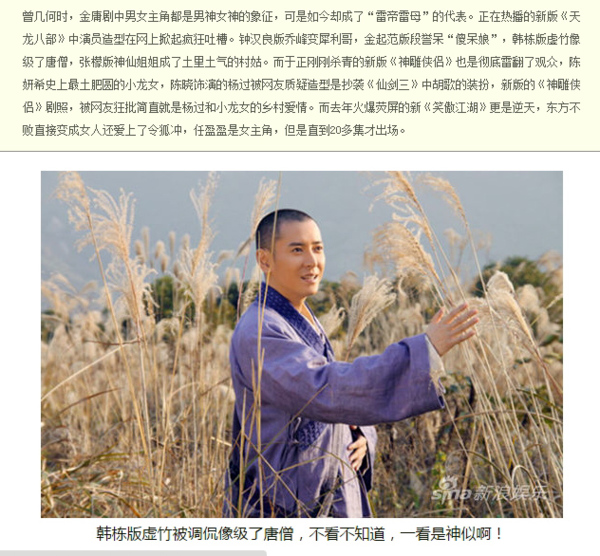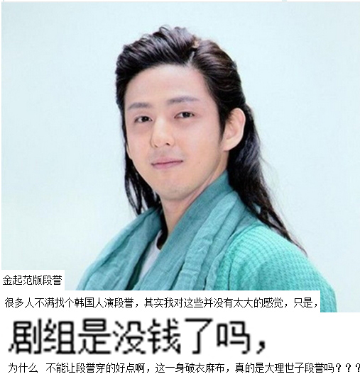 新版的神仙姊姊沒了仙氣卻變成俗氣村姑,原本張檬在美人心計與美人無淚的扮相還不錯,結果這新版的造型師也不知在幹啥???段譽找了韓國人金起範來演???其實這也不是第一次,張娜拉、蔡琳與張瑞希也在陸劇演個華人角色啥的,尤其張瑞希還演了秦腔名角????只不過網友吐嘈金起範一身蒼蠅綠沒貴氣只有油裏油氣!