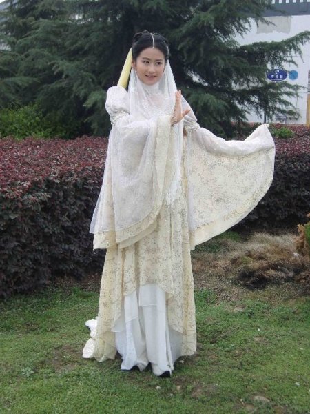 老實說,現在古裝服飾設計有的真是???搞怪居多,中圖這裝扮是為了防風砂???