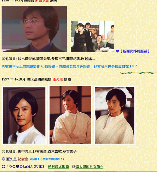 沒把阿信算在內~~~最早看的是亞久里,忘了是多少年前看的,雖然劇中演員大多不認識,而女主角田中美里我還誤認為是鈴木幸樹(愛情白皮書),而田中美里後來只有跟野內豐合的的網路情人成績較佳,之後嘛???似乎就在谷底了‧