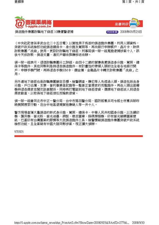 偽造證件集團詐騙地下錢莊 10嫌遭警逮捕 2008年