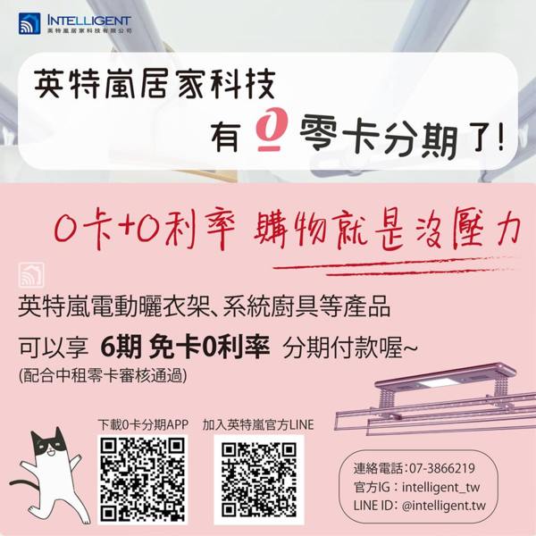 英特嵐電動曬衣架系列與系統廚具皆可分期付款喔~ 可直接下載app申請中租零卡分期會員 或點開以下連結申請(最高可分6期喔) https://www.chailease.com.tw/0Card/Sig...