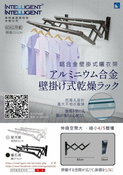 英特嵐|壁掛式伸縮曬衣架 家裡空間狹小,曬衣服總是沒地方 家裡沒陽台總是把衣服曬在室內 現在這些問題通通out! 壁掛式曬衣架把這些問題一次搞定 防風桿設計,不怕風大把衣服被吹走。 60公斤乘重力,不...