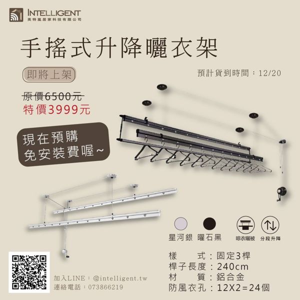 英特嵐手搖式升降曬衣架預購活動來囉~ 即日起預購手搖式曬衣架不用安裝費喔,千萬別錯過。 手搖曬衣架(三桿)3999含安裝活動至除夕夜為止,活動結束立即回覆原價,要訂要快。 高雄地區一律免安裝費。 外縣...
