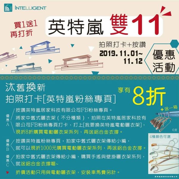 家裡的曬衣架已經老舊不堪了嗎? 這次對自己好一點吧,要裝就裝最好的。 英特嵐曬衣架絕對是你品質保證的好選擇 英特嵐雙11優惠活動,~不直打折,還買1送1~ 凡家裡老舊的曬衣架,都可以拍照傳給英特嵐小編...