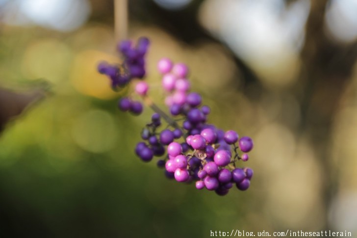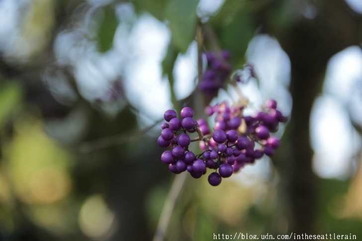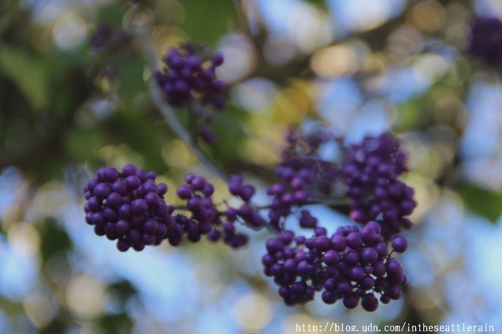 還有一種淺紫色薰衣草色的果子為秋日唱出讚歌﹐它叫 Beautyberry (Callicarpa) ﹐由於鳥類並不愛吃﹐專門留給人類欣賞。