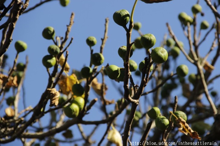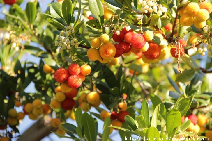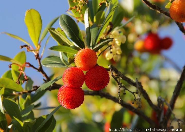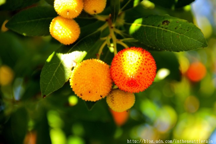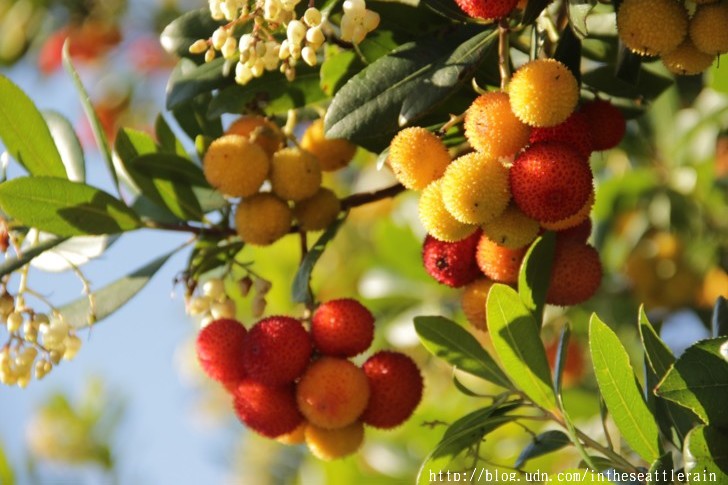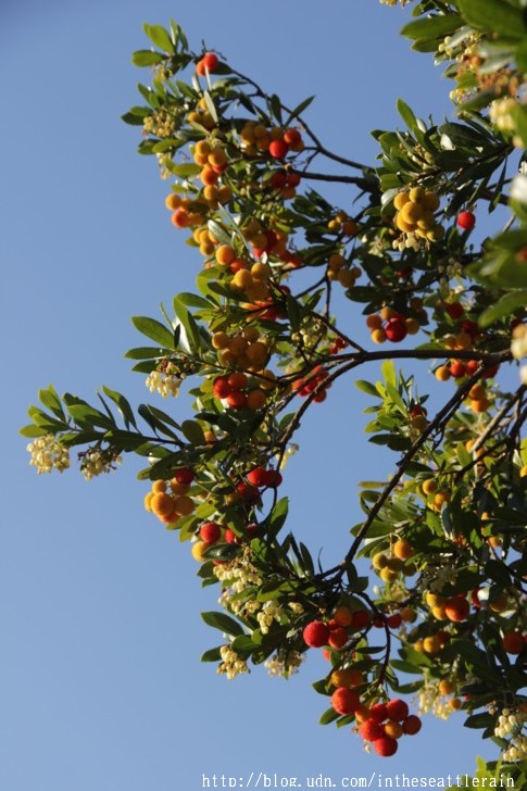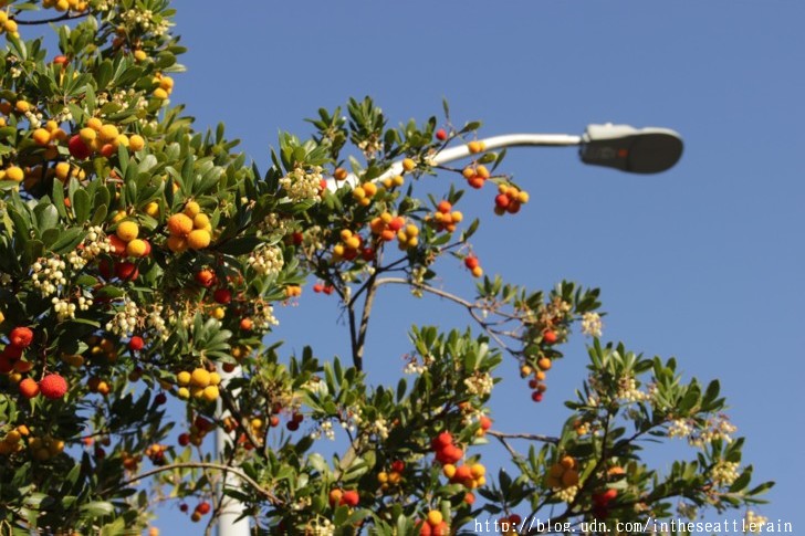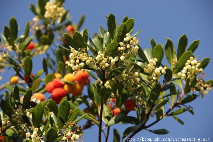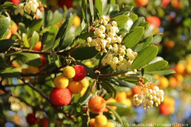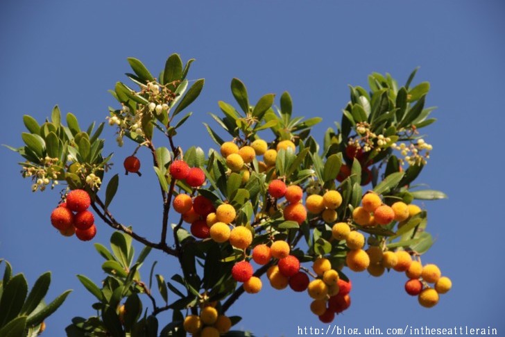 車子經過這棵默然一夏的樹﹐忽然像掛滿了叮叮噹噹的彩珠閃入餘光。Strawberry tree 草莓樹﹐(學名 Arbutus unedo), 每年秋季﹐連花帶果一齊登場﹐許多公園﹑私人花園﹑或路邊草坪都不忘種上幾棵﹐在萬樹皆蕭條的時候﹐獨享風華。