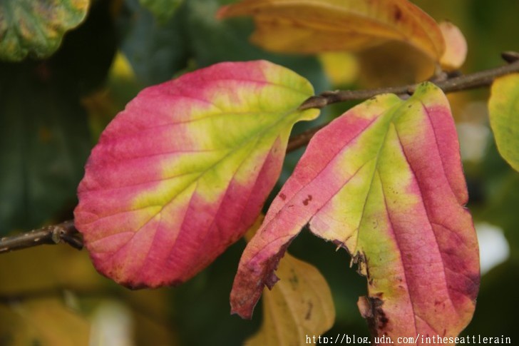 綠的﹑黃的﹑棕色的﹑紅色的…祖孫倆一下子就撿了一大堆﹐橡樹﹑楓樹﹑櫻樹﹑蘋果樹﹑銀杏樹…然後﹐我們走到校園中這棵樹旁邊﹐它是1999 年為慶祝地球節種下的 Persian parrotia (Parrotia persie),