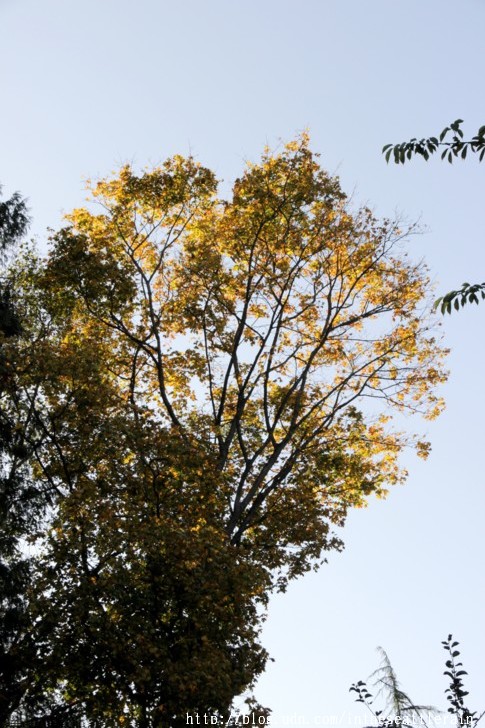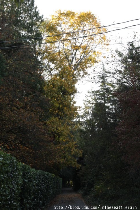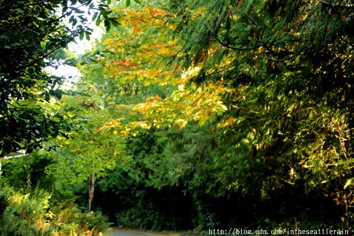 我家門前的小路被杉樹﹑楓樹和木蘭枝葉拱成的綠色隧道﹐秋來的時候開始染上一襲金黃。