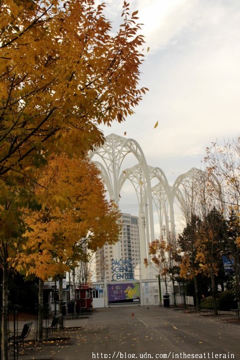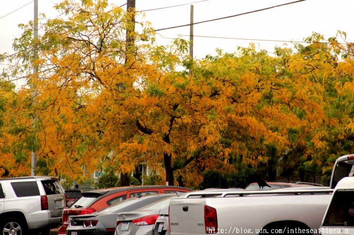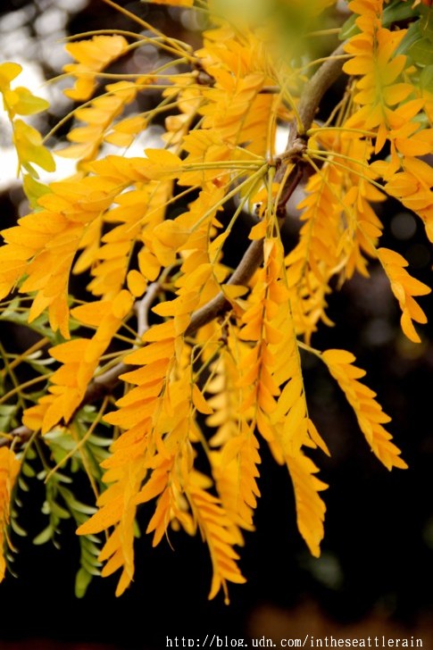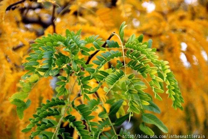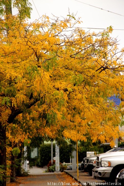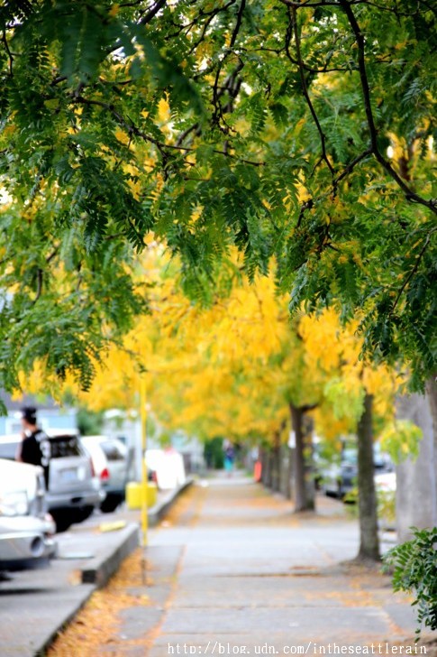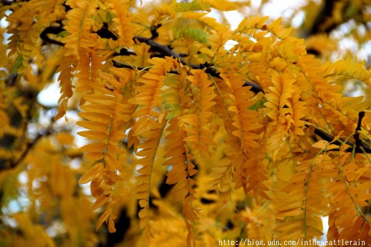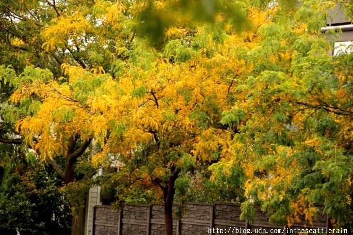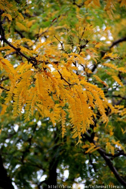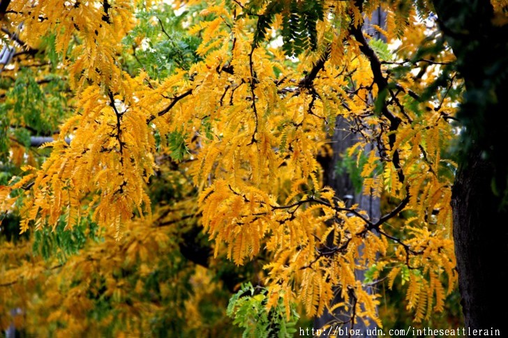 入秋以來﹐常常在轉角處飛來一片金黃﹐高聳的樹﹑細小的葉片﹐熱鬧了天際。這兩個周六陪同外孫女到西雅圖中心的兒童劇院上課﹐在科學中心前面的步道上﹐正遇著黃透了的它們隨風飄落。還見到有人在樹下打個盹。
