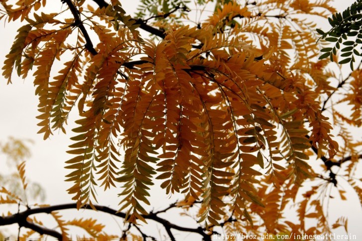 這是一種名叫 Honey Locust 的美國皂莢。細小的綠葉在盛夏是裊娜的點綴﹐秋天燦爛吸睛﹐即使葉子落了﹐隨風一吹就散了…