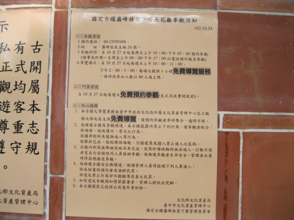 霧峰林宅分為頂厝、下厝,經文化部及台中市文化中心協調後,昨起每個周日局部開放,讓更多民眾以預約方式入園一睹古宅第的風貌,昨天第一個周日,一早預約的民眾已在下厝的本堂厝前等待,由下厝管理委員會人員叫號,四十人一個梯次入內參觀,並有專人導覽。