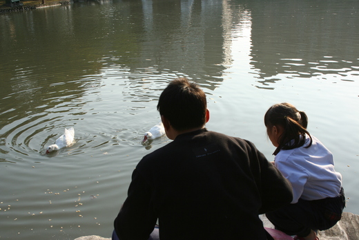 那一天,我到台中中山公園攝影.在湖邊,我看到一個父親帶著他的上小學的女兒蛤拿了一包玉米花在餵鴉子和魚.我覺的畫面很溫馨,很美.我既刻拿起相機拍攝.拍攝,除了畫面溫馨感人之外同時看到父親手上拿了一張報紙,打開的一面正是分類廣告的人事欗.當時感人的情境讓我對這位失業的父親敬佩萬分因此拍下這張照片: