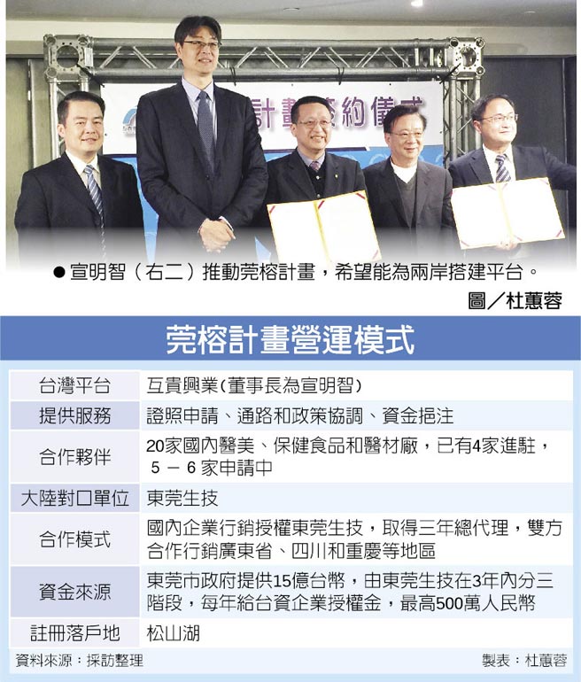 「莞榕計畫」是宣明智搭起的兩岸生技業合作平台,由他所創辦的互貴興業,初步從數十家台灣生技公司中,遴選出20家具發展潛力的公司,前往東莞松山湖組成台灣/東莞生醫園區,第4季起將正式啟動。