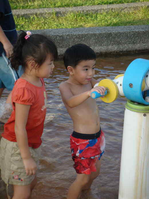 因為上週已經來探路過先,所以這次我們是有備而來,FeFe的泳褲、多一套替換的衣服褲子還有毛巾,看到親水池,FeFe已經顧不得媽媽在後面的叮嚀,馬上和璇璇兩人瘋在一起了!! 因為這裡腹地太大,吼孩子幾聲就顯無力,我認真思考地說:"下次來,應該要帶大聲公或是加油棒才行啊~",否則都"管"不住孩子了!!