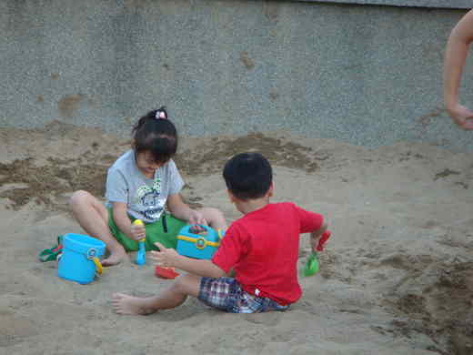日頭漸漸弱了,風也漸漸強了,為了怕孩子們感冒著涼,趕緊讓她們轉移陣地到[沙坑]。