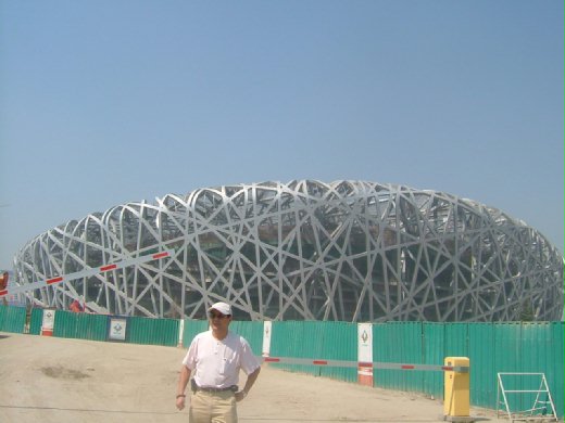 北京奧運體育公園裡,處處在加緊趕工,黃沙漫天、塵土飛揚,工程車進進出出,施工人員一大批一大批的穿梭其中,還有像我們一樣好奇的觀光客也不少,許多人擠在沒有圍籬的柵門口,搶著好角度拍照,還有人央著守衛想溜進去拍照。