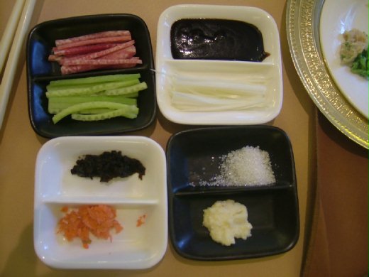 沾醬配料---除了有麵醬大蔥之外,還有砂糖蒜泥,黃瓜絲與醬菜,請見照片。鴨餅醬蔥加了黃瓜絲多了清爽口感,就像炸醬麵或涼麵的必搭小黃瓜絲一般,甘脆爽俐。蒜泥是大蔥之外的另一選擇,我一向愛大蒜勝於蔥薑,所以必有幾捲是用蒜泥的喲。至於砂糖嘛,是專門伺候鴨皮的,片得薄可透光的香酥鴨皮,沾上砂糖送入口中,嗯嗯!香甜酥脆,入口即化,不油膩不焦乾,恰到好處。至於醬菜,聽說是吃完後清口用的,很抱歉我沒有試過所以在此就不提啦。