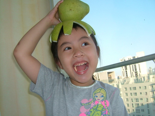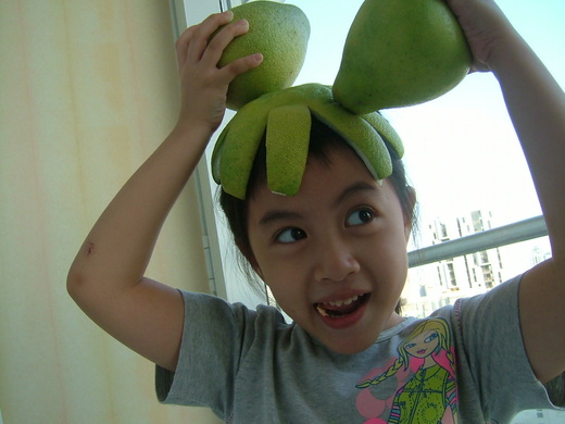 剝一個文旦, 小鬼們先只記得搶柚皮帽戴呢 ! 掰出了一瓣瓣果肉, 嚐了一口......