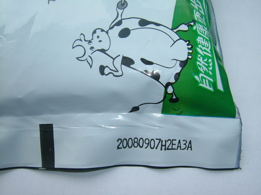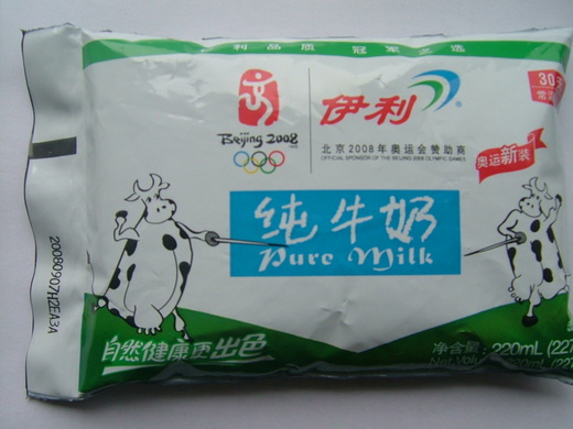 剛來北京時,只覺得這裡的牛奶好便宜喔,一小包(盒)只要一塊多人民幣,試了幾種牌子,後來就一直喝伊利的,照片上的是 袋裝奶 保存期限是一個月,也有利樂包的,保存期限就較長--九個月,