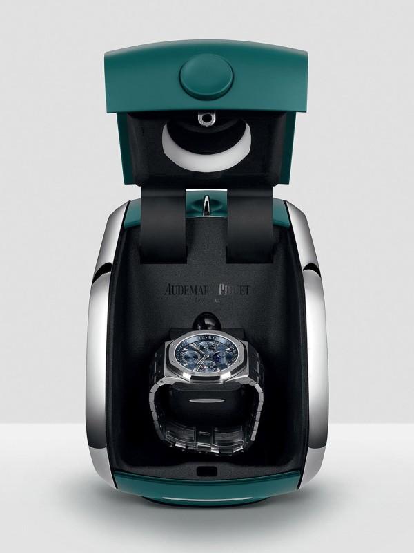 愛彼顯然不想讓這件事成為阻礙,像是他們開發的新機芯7138的設計已針對便利性做了大幅改革,把所有校正功能集中到一個錶冠上,取消側面隱藏按把,操作時直覺許多,但品牌想做的還不只重新設計機芯,而是把「完全不需要自己設定」變成可能。這也讓愛彼開啟與DFF的跨領域合作,把機械工程、視覺演算、AI、機器人技術全部加入,集合成這個「盒子」原型。