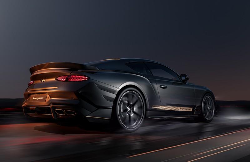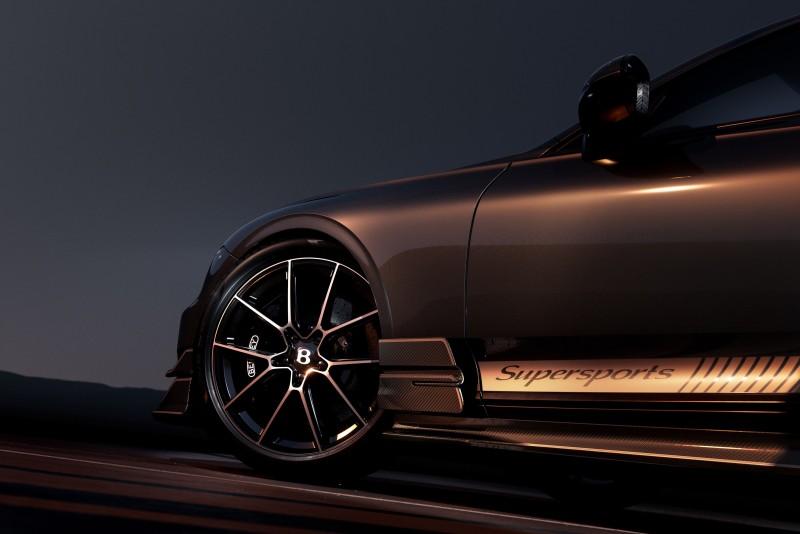 Bentley Supersports外觀造型是歷來最具運動感的 Continental GT,以一系列空力效益導向的設計提升下壓力與減輕車身重量。新款前保桿整合了賓利史上最大尺寸的前擾流板,更有效地導入冷卻氣流至引擎與前煞車。碳纖維導流片、側裙、葉子板、後擴散器與固定式尾翼的組合,比 Continental GT Speed 增加了300 公斤的下壓力。輕量化設計也延伸到了車頂,通常採用鋁製車頂的車型,這次被碳纖維面板取代,這不僅減輕了重量,還降低了整車的重心,全車總重壓低至兩噸以下。足下是碳陶瓷煞車、與 Manthey Racing 共同開發的 22 吋鍛造輪圈,以及 Akrapovič 全段鈦合金排氣系統皆為標準配備,並可選配 Pirelli Trofeo RS 高性能胎。