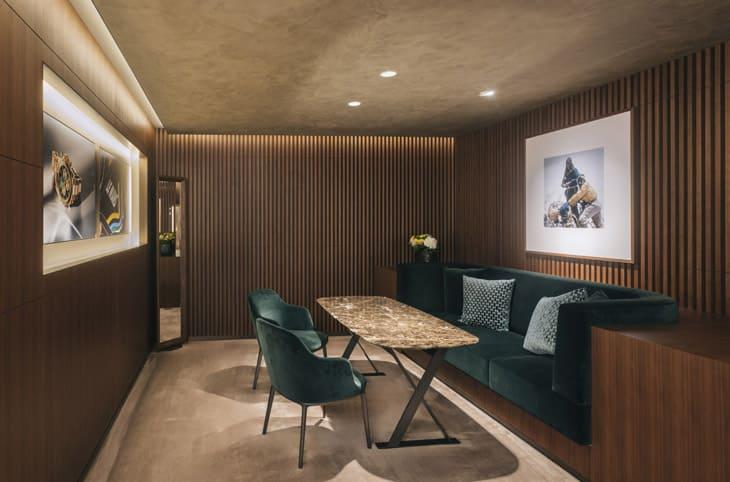 踏入店內,焦點落在接待區上方的吊燈,圓拱造型向勞力士標誌性小窗凸透鏡(Cyclops Lens)致敬,讓功能設計幻化成實用與藝術意義兼具的裝置,成為最吸睛的「彩蛋」。店內氛圍營造講究材質與光影層次,包括胡桃木實木、青銅與黃銅金屬點綴,營造沉穩高貴的質感,座椅採用綠色天鵝絨與皮革軟墊,讓鑑賞手錶的體驗既舒適又能與店面統一視覺感受。
