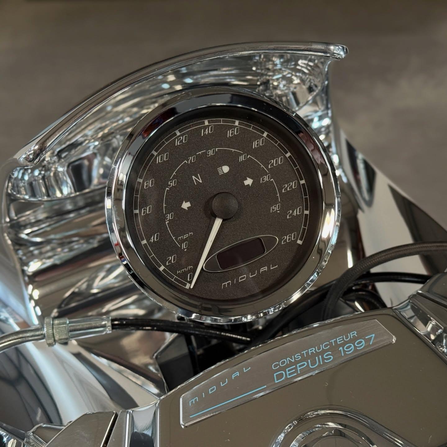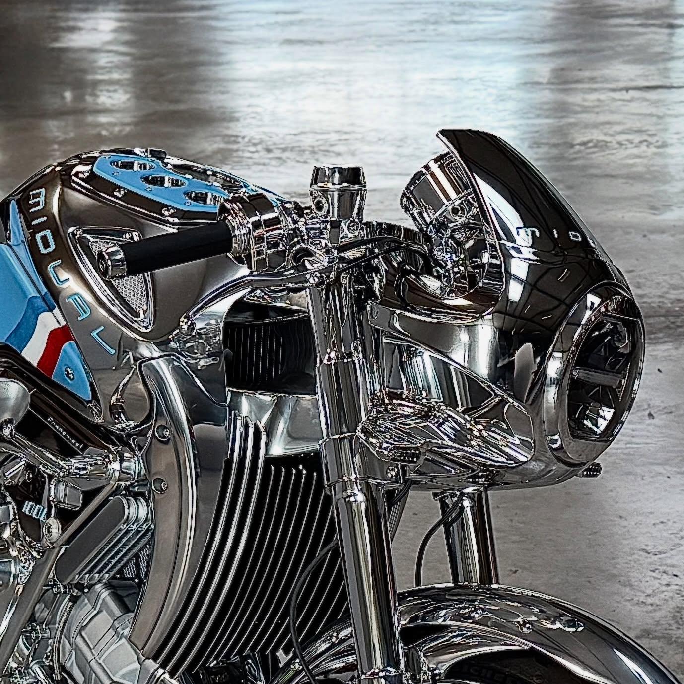 Française 是以 Midual 旗下的 Type 1 Series 3 為基礎打造。外觀上,它換上了更具跑格的低把手與車頭整流罩(風鏡),圓形頭燈上方覆蓋的線條帶出了濃厚的復古賽車韻味,後照鏡則安裝在相當特別的位置。油箱上繪有法國國旗圖樣,還有多個儀表直接鑲嵌在油箱上,搭配獨特的藍色皮革座椅,在視覺上與品牌其他車款做出了明顯區隔。車尾則維持了品牌一貫的纖細線條,展現出優雅的法式身段。