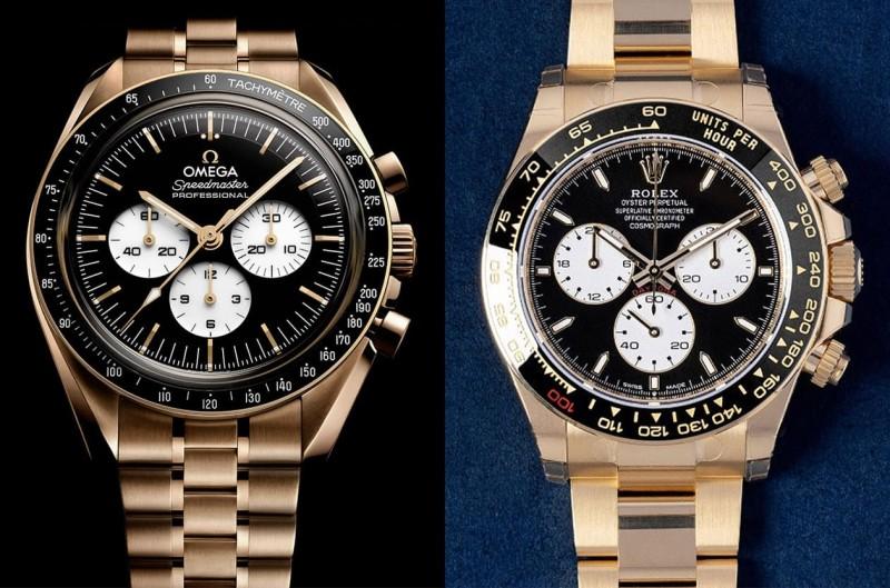 在當代高級製錶領域中,歐米茄與勞力士各自擁有最具代表性的運動計時系列,當兩大品牌不約而同以黃金材質結合反熊貓面盤元素時,這場對比就不只是規格上的較量,更是兩種歷史傳承與風格哲學的正面交鋒。