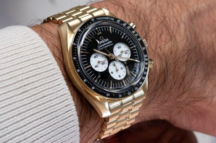 整只錶殼與鍊帶皆以歐米茄獨家18K Moonshine™金製成。這種合金的色調比傳統黃金更柔和,帶一點冷冽月光般的淡雅光澤,不會過於張揚,卻能在光線下自然流動,42mm的不對稱錶殼依舊是登月錶的標準輪廓,扭轉式錶耳與側邊微凹設計,乃是數十年來累積的佩戴經驗結晶。黑色陶瓷測速錶圈鑲嵌在Moonshine™金底座上,亮面質感與黑白面盤呼應,白色琺瑯刻度清晰銳利,「數字90上圓點」細節完整保留,對資深錶迷而言是一種情感連結。鍊帶採用復古五珠結構,拉絲與拋光交錯處理,從20mm自然收窄至錶扣,貼手度相當優秀,摺疊錶扣整合微調系統,實際上手時,你會發現這只全金計時碼錶並沒有想像中「壓手」,反而因比例與重心分配得宜,戴起來穩重卻不笨重,它給你的不是炫耀感,而是一種踏實而自信的重量。