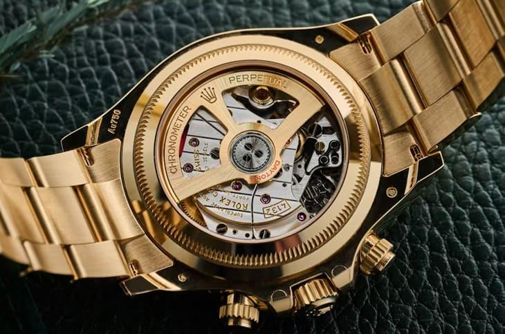 驅動126528LN的,是專為這款特別版本打造的4132自動機芯,最關鍵的差異,在於原本的12小時計時盤被改為24小時計時盤,直接對應利曼24小時耐力賽的賽事精神,這項改動並非簡單調整,而是涉及齒輪比與傳動結構的重新設計。機芯採用導柱輪與垂直離合結構,啟動與歸零動作俐落乾脆,震頻4Hz,動力儲存約72小時,日常佩戴相當穩定,Parachrom游絲與Chronergy擒縱系統確保抗磁與效率表現,維持品牌一貫的高標準精準度;而且特別的是,它配備透明底蓋,對於一向保守的勞力士運動款而言,這是少見配置,藍寶石水晶底蓋下可以欣賞到機芯細節與打磨質感,讓機械結構成為設計的一部分,令人驚覺原來耀眼的黃金計時碼錶,其內在結構同樣具備高技術含量。