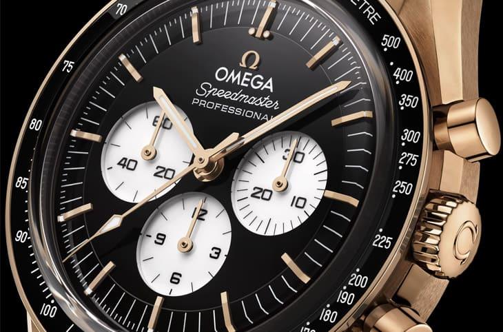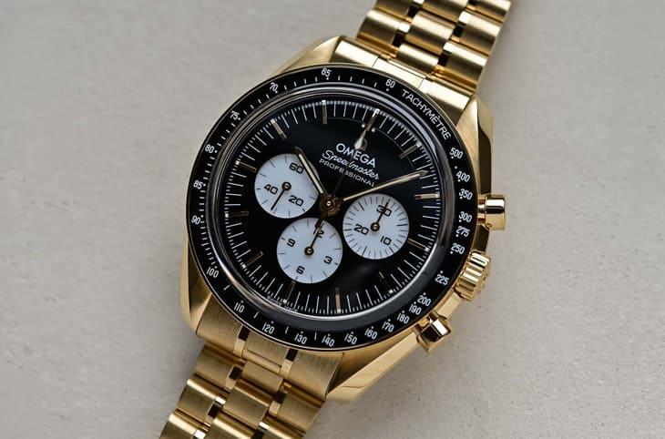 通常一談到登月錶,多數人腦海裡浮現的,是那只陪伴阿波羅11號太空人踏上月球的經典黑面計時碼錶,不過這回主角,則是把熟悉的傳奇輪廓換上一身更華麗的金色戰袍,歐米茄2026年新登場的18K Moonshine™金反熊貓面超霸。黑底、白色小錶盤的強烈對比,本來就自帶戲劇張力,如今再加上溫潤柔和的Moonshine™金色澤,整體氣場直接升級。