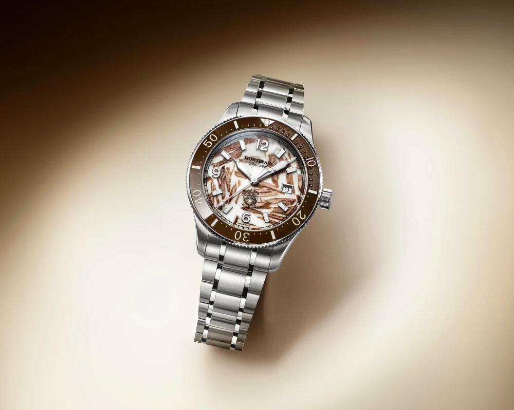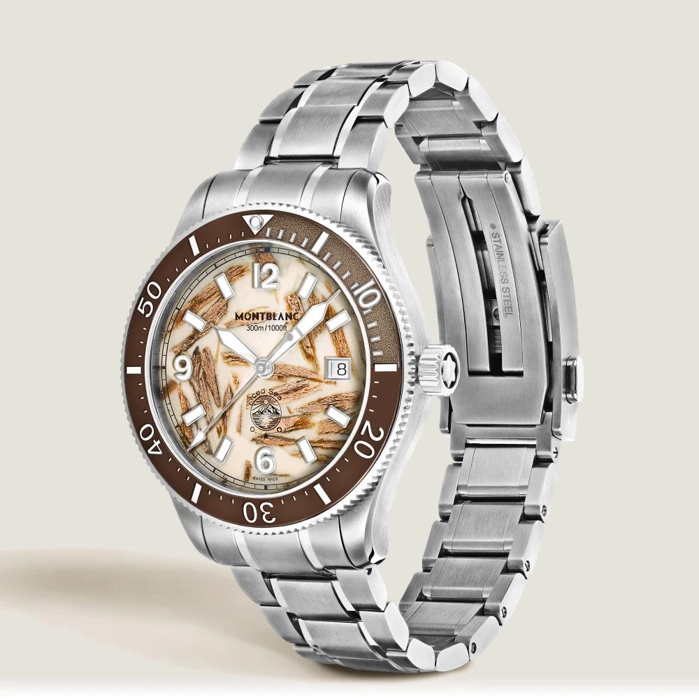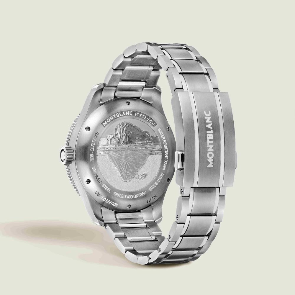 41mm 精鋼錶殼搭配 300 米防水,本來就已經夠硬派,但 MONTBLANC 再加一個關鍵技術——「零氧」。簡單來說就是把錶殼內的氧氣抽掉,降低冷凝產生的風險,讓腕錶在極端溫差與高壓環境下依然穩定運作。錶背則用 3D 雷射刻出潛水員與冰山畫面,把整個「冰 × 探索」故事收在細節裡。