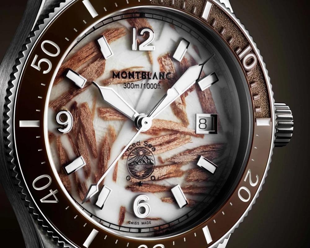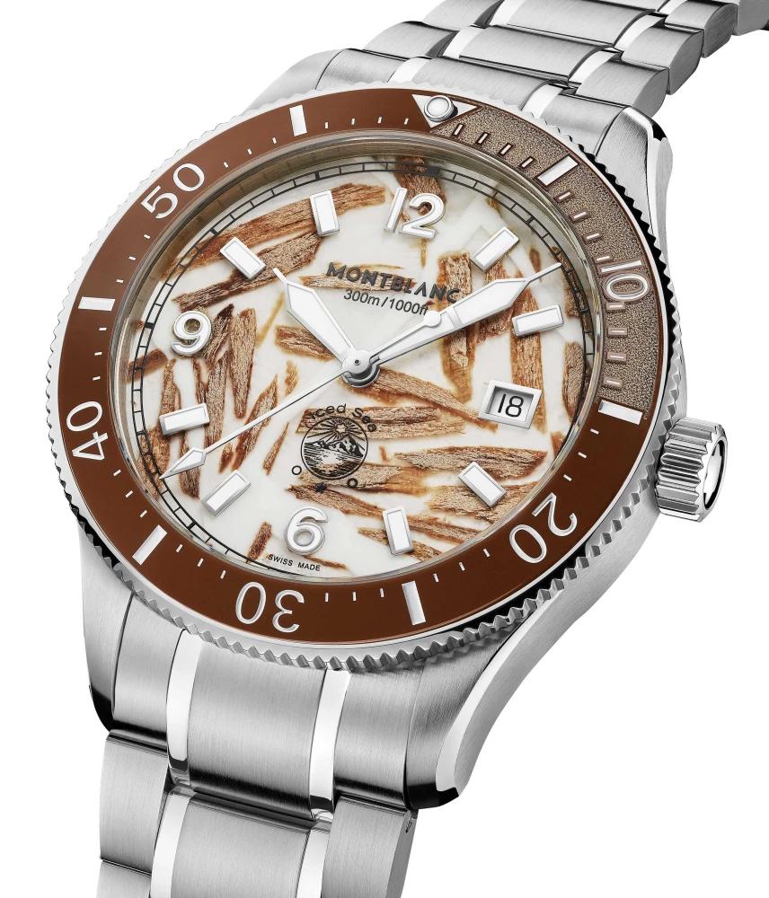 這款錶的靈魂,來自白朗峰最大冰川——Mer de Glace(冰海冰川)。冰川在數百年流動過程中,會把倒下的樹木壓進冰層,形成被完整保存的「亞化石木材」。MONTBLANC 這次直接把這段自然歷史搬進錶盤——透過與霞慕尼登山者合作,從冰磧中取回木材,切割成碎片後,再以「看似隨機」的方式排列,最後用透明樹脂封存,營造出宛如冰封的層次視覺。這些木片是真的,時間是真的,連紋理都無法複製。