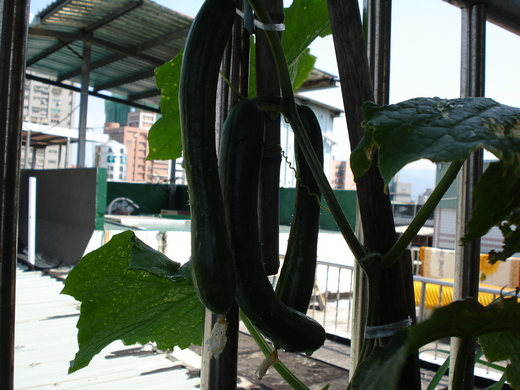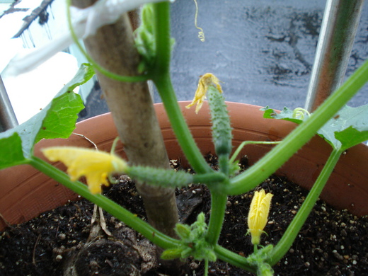 但是隨著日子一天天過去,小黃瓜苗努力長高,花也不停地綻放,總算有授粉成功的小瓜出現了,而且一次還長了三條小瓜,早晨和傍晚的澆水作業成了每天的例行功課,努力果然有所收穫,你看!頂樓的小黃瓜要收成了,今晚加菜喔!