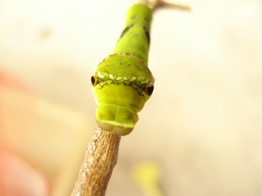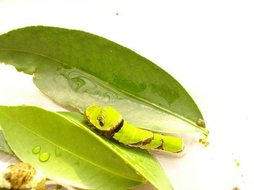 6月30日,傍晚換葉子時,打開蓋在盒子上頭的厚紙板,發現牠不一樣耶,和原來養的無尾鳳蝶終齡毛蟲竟然不一樣,大大的假眼,超可愛的,趕緊上網查資料,原來牠是黑鳳蝶的幼蟲,真是驚喜!第一次養毛蟲竟然讓我一次養到二個品種,超開心的!不過開心之餘,發現毛蟲又少了一隻,哎,怎麼又失蹤了呢?!開始懷疑有不良份子偷襲我的寶貝,只好趕緊更換地方飼養,希望剩下的毛蟲能平安長大化蝶。