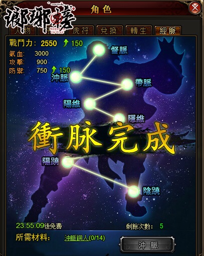 不管在醫學著作還是在武俠小說中,人的經脈系統對人的身體機能都產生著極其深遠的影響!遊戲中的「筋脈系統」開啟於角色68級,玩家通過沖脈便可逐漸打通經脈提升人物屬性,且每24小時都可獲得一次免費沖脈的機會!