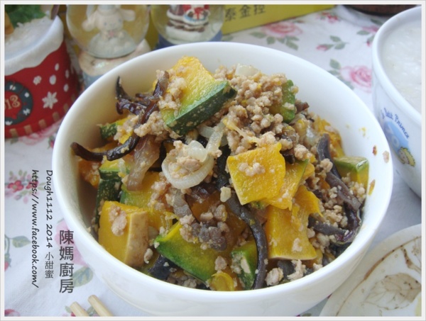 搭配肉末 洋蔥炒香 放進南瓜 木耳