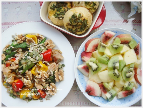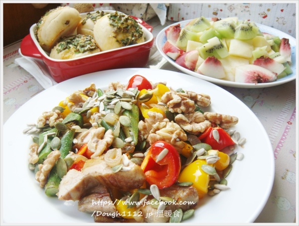 煎豬排 洋蔥 紅椒 黃椒 秋葵 ..灑上烘過的堅果籽