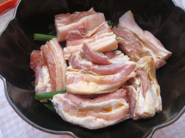 鍋底鋪滿有機蔥尾 在放上肉塊