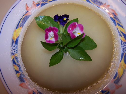 4 擺盤後再淋上湯汁,再加上裝飾的九層塔及自家種的花 ,