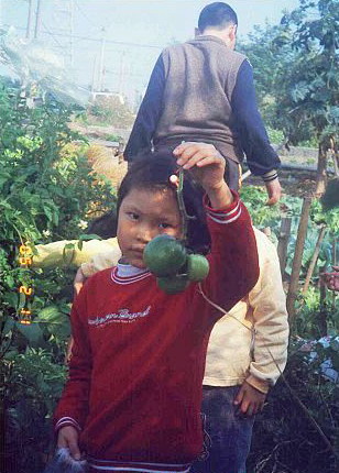 翻開相本,找出前年(2005年)初春,孩子們下田幫忙收成的照片.我突然發現:Eric的嬰兒肥真是可愛呀!就像那圓嘟嘟的番茄一樣.而且,前年開始,他對農事便很有興趣,更別說分配給他一畦甕菜(空心菜)採收,他沒兩三下就完工了,而Mary還在推三阻四的想逃避工作.