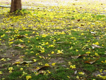 下圖,風雨過後落滿地的阿伯勒,目前它的節令已經過去了,"滿地黃花堆積,憔悴損."大概就是這般情景吧?攝於2008.04