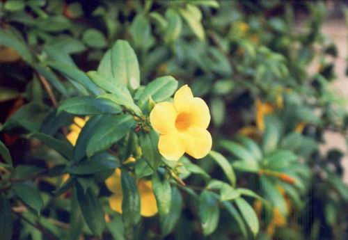 形態描述或特徵: 盆栽,庭栽,花棚,全株可藥用。陽性植物,生性強健,花期5~12月,全株具毒性。常綠蔓性灌木,莖可長達6公尺,枝條不具攀緣性,莖葉有乳汁;葉長橢圓形,全緣,3~4片輪生,光滑革質;花頂生,花冠鮮黃色,先端5裂的漏斗狀。