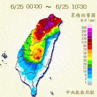 依據氣象局統計,今天0時到上午7時20分,新北市新店及淡水、苗栗泰安、新竹尖石及五峰、台北市陽明山都降下豪雨,累積雨量最多的是新店181毫米。