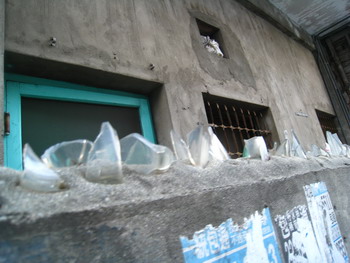 不論,完全不論我之前是多麼喜愛這個眷村,我的鄰居們. 沒想到,我之前說的話是錯的.這一帶還是留有這樣的玻璃刺圍牆.只是,她隱藏在轉彎的一個角落,屋前更早時堆放了一些鄰戶的裝潢建材.我曾得意洋洋的說道:...