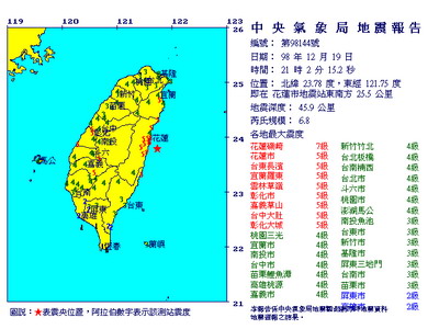 20120610補註: 宜蘭外海凌晨6.5地震 20100308補註: 下午五點多時,嘉義5.1級的地震;打電話給媽,她也適巧聽到咚咚的地鳴,但比起之前甲仙埔的地震,地鳴長而悶哼;老媽說,這次還好。擔...
