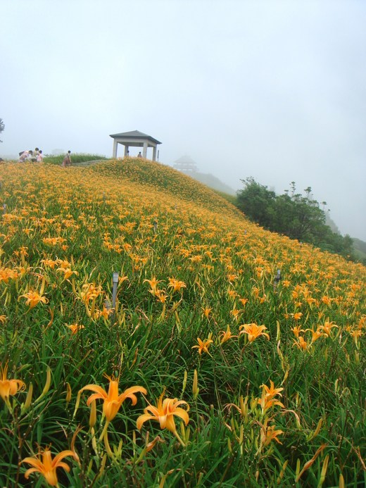 整片山坡,有高有低,在涼亭觀景台看下去,覺得很空曠,不禁讓人心胸開闊起來。金針花雖然沒有佔滿整片山坡,但單單一小片的景就很美麗了。到另一景點時,走在金針花田中石頭鋪的小徑上,隨著風飄來的山嵐霧氣,我想這時如果穿的飄逸一點,隨風舞動,還真有雲中仙子的感覺。好美。當然的拍了好多相片。