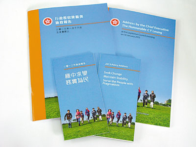 特首梁振英昨日發表的施政報告以「穩中求變、務實為民」為題,報告封面設計同樣是「穩中求變」,改變以往只是單一顏色設計,首次採用一張香港青少年人向前跑的相片。他在記者會上形容,自己選擇以青年人向前跑的相片作為封面,是象徵今屆政府的施政方針是以人為本,帶領社會前瞻,而照片特意安排不同族裔的青少年人,是希望展現「我們是700萬人一個大家庭,家是香港,同是一家人」的精神。